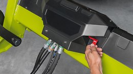 Mit einem Handgriff schließen Sie auch unter Druck die hydraulischen Verbindungen der Werkzeuge zum Frontlader. Sie werden nie wieder die Anschlüsse verwechseln. Dank der flachdichtenden Kuppler gehören Ölflecken auf dem Boden der Vergangenheit an.